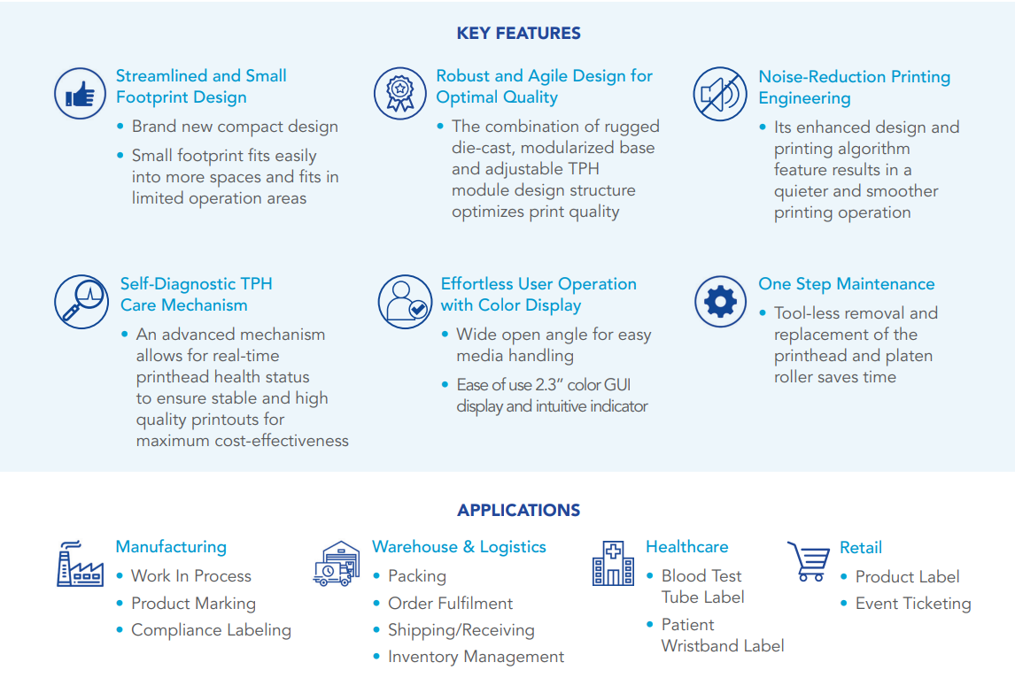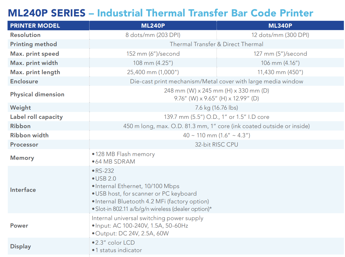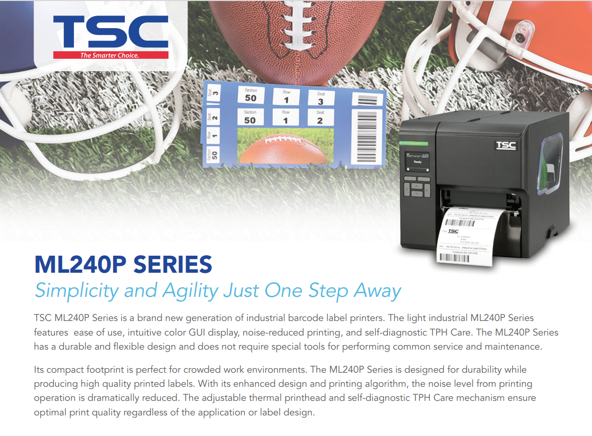 ​​​​​​​​​​​ TSC ML240P Series คือเครื่องพิมพ์ฉลากบาร์โค้ดอุตสาหกรรมรุ่นใหม่ ซีรีส์ ML240P อุตสาหกรรมเบาโดดเด่นด้วยการใช้งานที่ง่ายดาย จอแสดงผล GUI สีที่ใช้งานง่าย การพิมพ์ที่ลดเสียงรบกวน และการดูแล TPH ที่วินิจฉัยตัวเอง ซีรีส์ ML240P มีการออกแบบที่ทนทานและยืดหยุ่น และไม่ต้องใช้เครื่องมือพิเศษในการให้บริการและบำรุงรักษาทั่วไป ตัวเครื่องมีขนาดกะทัดรัดเหมาะสำหรับสภาพแวดล้อมการทำงานที่มีผู้คนหนาแน่น ซีรี่ส์ ML240P ได้รับการออกแบบมาเพื่อความทนทานในขณะที่ผลิตฉลากพิมพ์คุณภาพสูง ด้วยการออกแบบและอัลกอริธึมการพิมพ์ที่ได้รับการปรับปรุง ระดับเสียงรบกวนจากการพิมพ์จึงลดลงอย่างมาก หัวพิมพ์ความร้อนแบบปรับได้และกลไกการดูแล TPH วินิจฉัยตัวเอง ช่วยให้มั่นใจในคุณภาพการพิมพ์สูงสุด โดยไม่คำนึงถึงการใช้งานหรือการออกแบบฉลาก